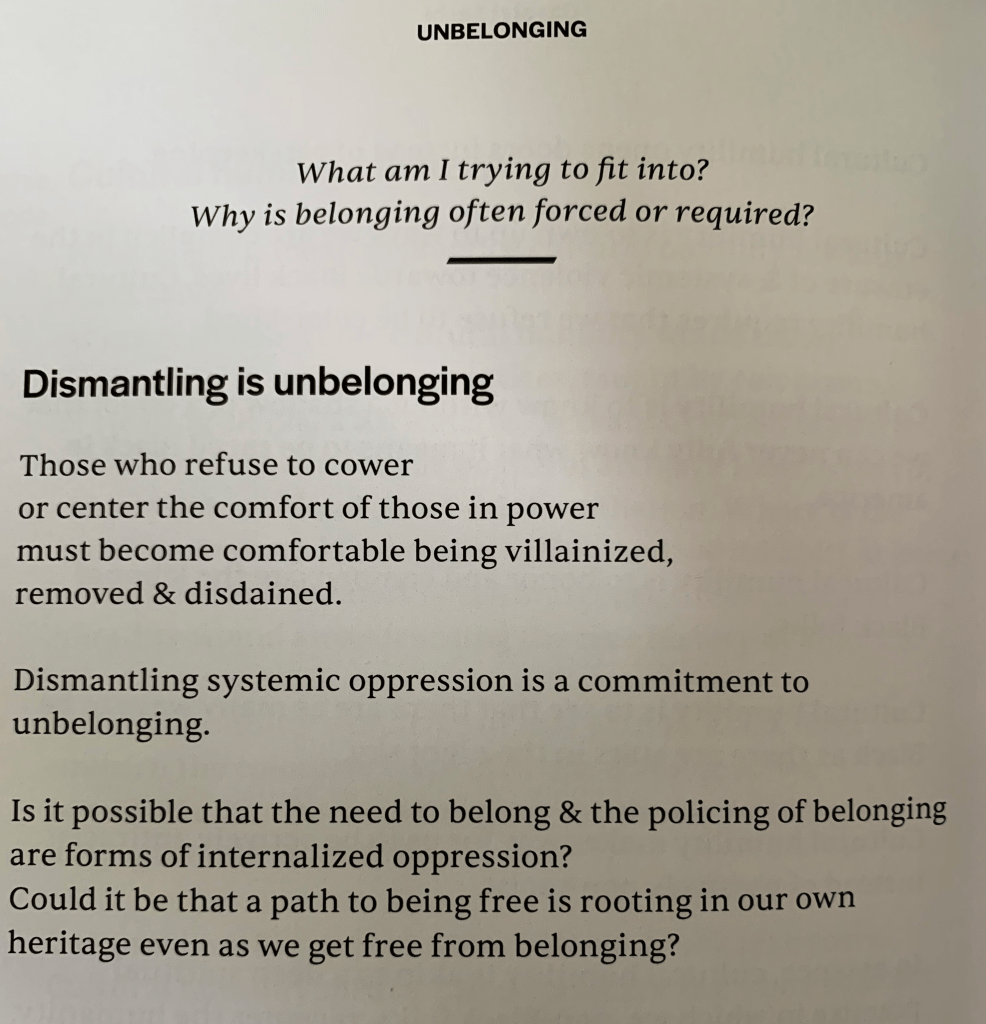 If this unbelonging then is a praxis of liberation, then how is it informed, and from where does it stem? It is ancestral. The ancestors and kin in Unbelonging span continents and centuries, they include the generations of Punjabi nanis my partner never knew, the Tanzanian care-givers of her infancy, they include my mother and her ancestors brought to america in chains.
