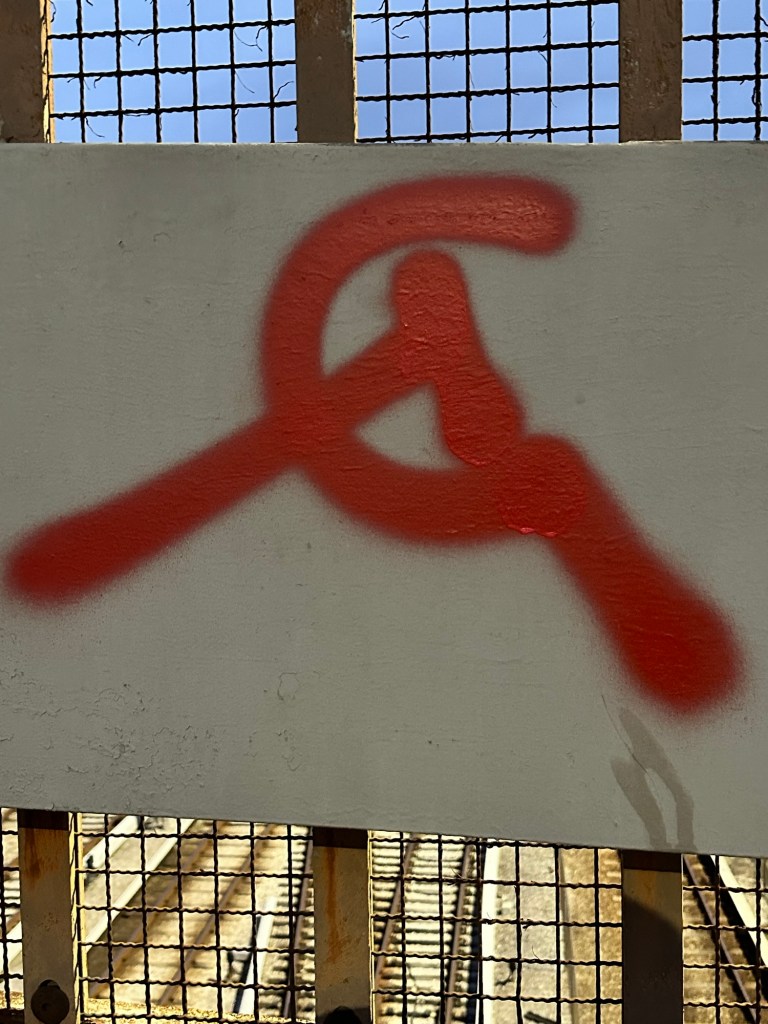 Excited to see the hammer and sickle graffiti on Decatur’s Sam’s Crossing bridge this morning.